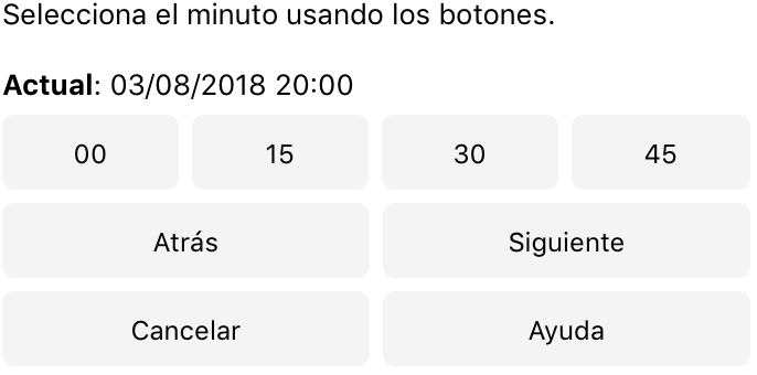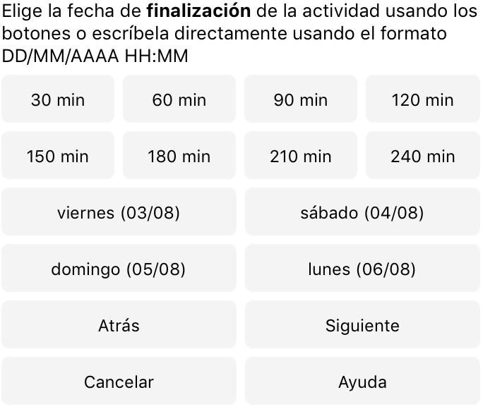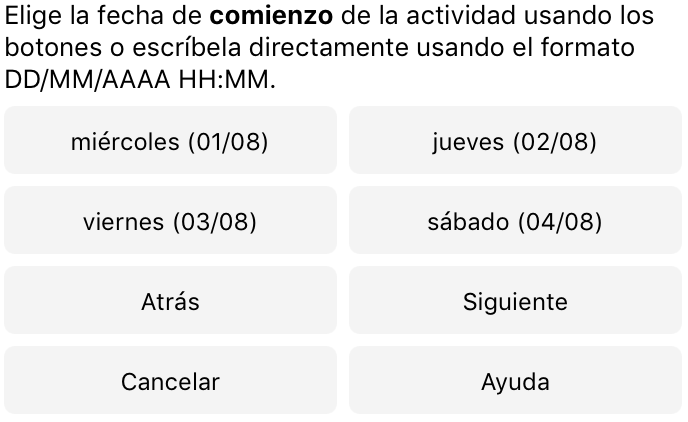 Elige la fecha de comienzo de la actividad usando los botones o enviándola directamente usando el formato DD/MM/AAAA HH:MM.