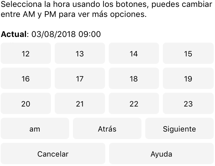 Selecciona la hora usando los botones, puedes cambiar entre AM y PM para ver más opciones.