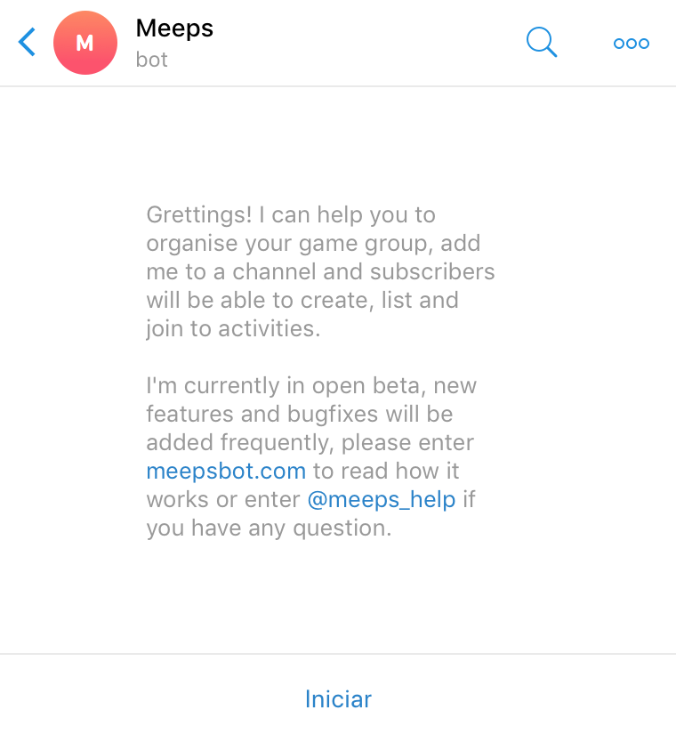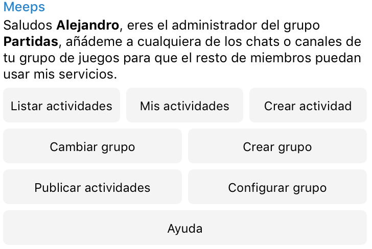 Siempre que escribas /start en el chat con Meeps se mostrará el mensaje anterior listando las acciones principales que puedes realizar con el bot.